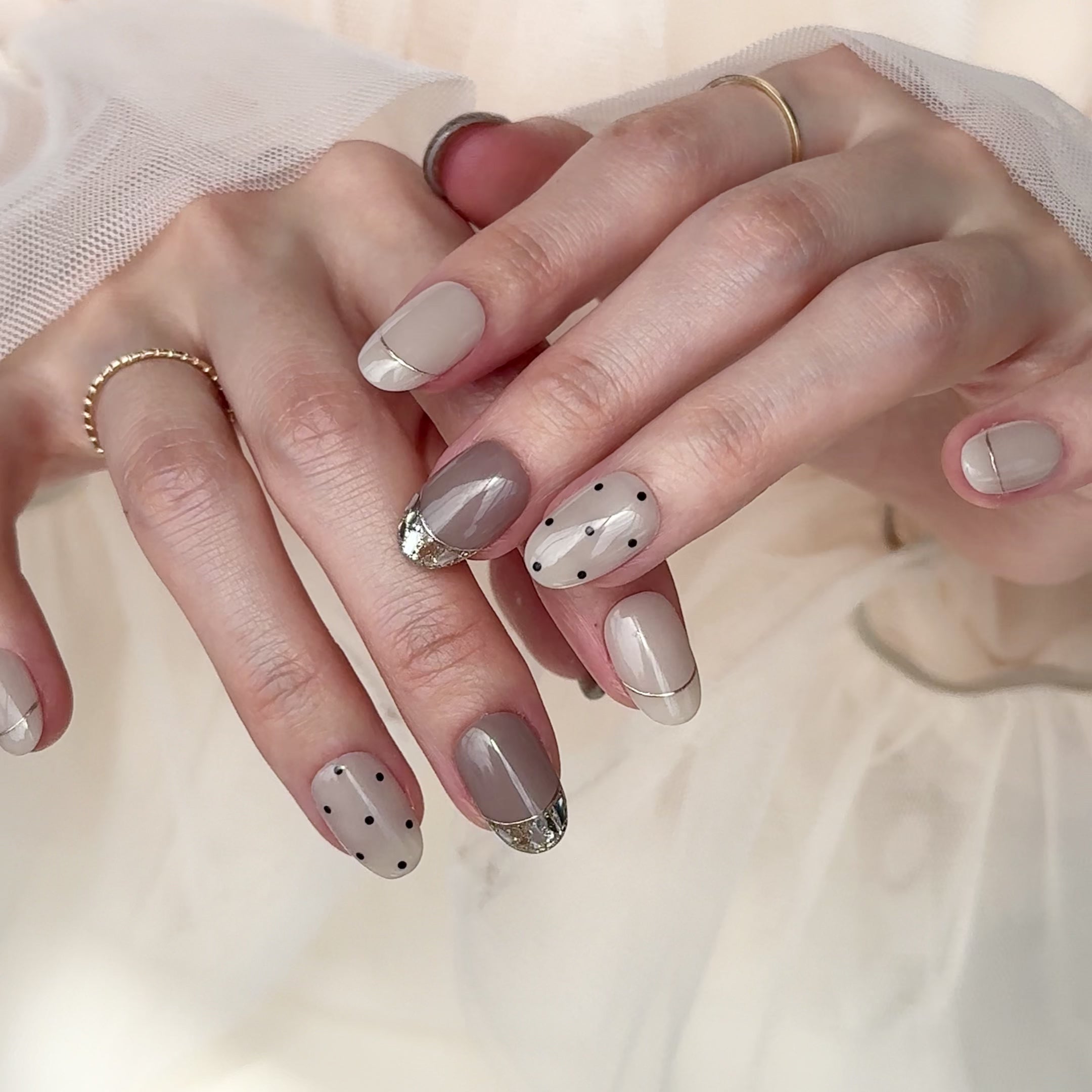 ※1つ1つネイリストがお作りしておりますので、サンプルと全く同じとは限りません。また、気を付けながら作成しておりますが手作業ですので稀にホコリや細かい傷などが入ってしまう場合がございます。予めご了承ください。